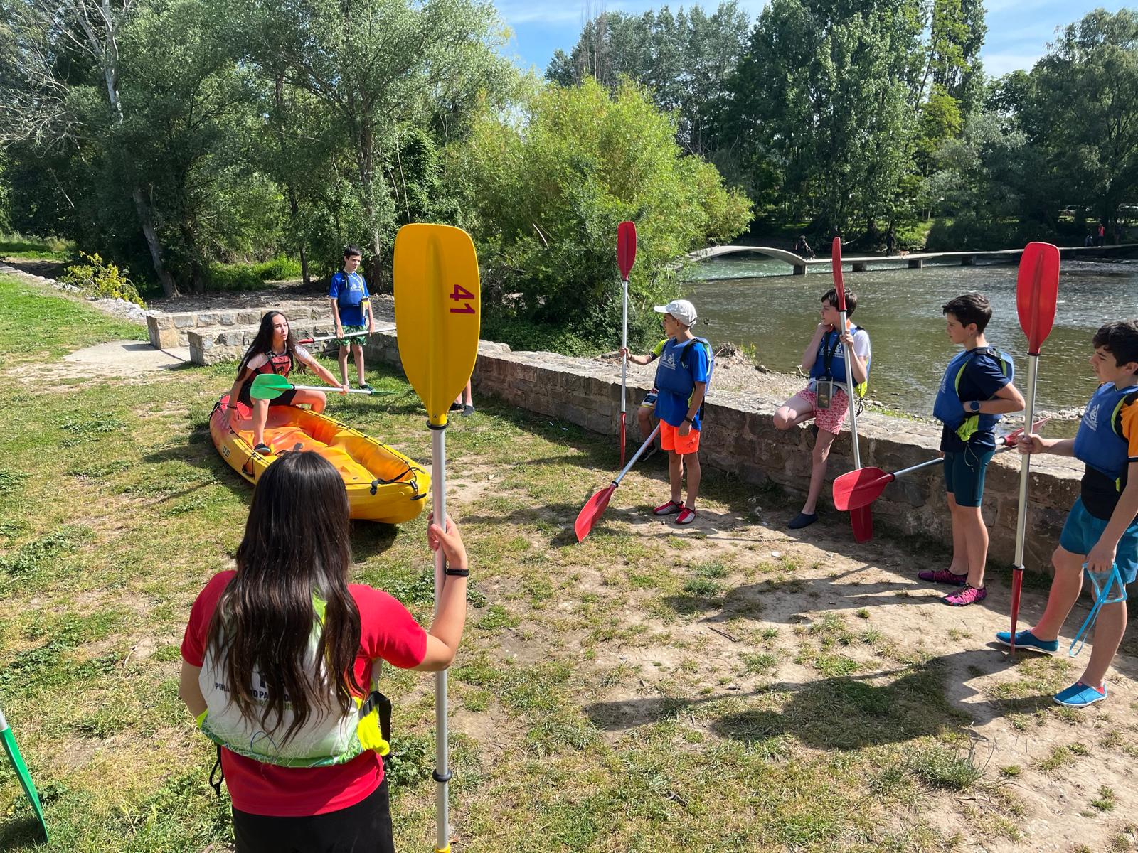La actividad con los menores se realiza en el río Arga en kayaks dobles, haciendo juegos y actividades para que sea más dinámico. 🚣‍♀️