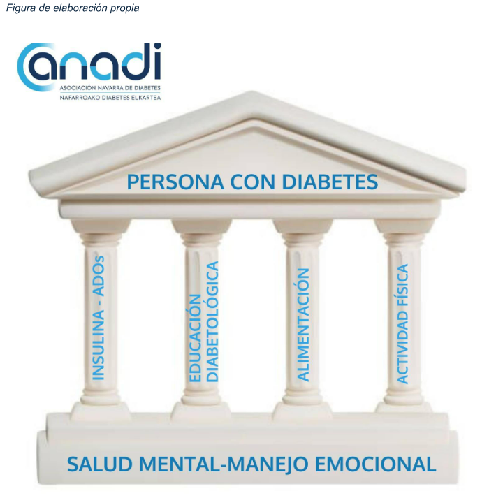 En conclusión, en el manejo y tratamiento de la diabetes l@s profesionales sanitari@s nos centramos muchas veces en el tratamiento farmacológico el cual, siendo indispensable, es uno de los varios pilares que sostienen a la persona con diabetes (ya sea con diabetes tipo1 o diabetes tipo 2), junto con el ejercicio físico, un buen plan nutricional y la educación diabetológica que es básica y fundamental para el correcto manejo de la enfermedad. Todas las especialidades de la mano para un abordaje integral de la persona con diabetes, teniendo como base una adecuada salud mental. Sin una base sólida de cuidados en salud mental y una buena educación emocional, el resto de las intervenciones en la que l@s profesionales podamos intervenir, no arraigarán ni se adherirán a la persona que padece la enfermedad (ver Figura 1). En ANADI, contamos con la presencia de Ana Pinedo Gárriz y Ángela Aragón Álvarez psicólogas en Pamplona y Tudela respectivamente que, en caso de que lo necesites, te pueden acompañar en este camino a través de consultas individuales y/o intervenciones grupales y darte las herramientas necesarias para que construyas tu propio “kit diabetil emocional”