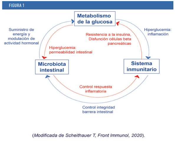 Los estudios encaminados a investigar la relación de la microbiota intestinal con el desarrollo de enfermedades metabólicas como la Diabetes Tipo 2 (DT2), u otras como la obesidad, tienen un triple abordaje: la acción de microbiota intestinal, su influencia en el sistema inmunológico y, por otro lado, en el metabolismo de la glucosa (ver Figura 2):