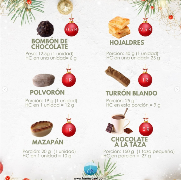 - Reparte los hidratos de carbono totales de la comida entre el picoteo o aperitivo, el plato principal y el postre. Conviene que los azúcares de los postres no superen el 50% de las raciones totales de la comida para evitar una hiperglucemia después de comer. Recuerda las equivalencias en raciones de hidratos de carbono de los alimentos típicos de Navidad (ver siguiente apartado con las infografías).