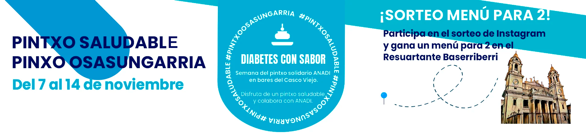 Durante la semana del 7 al 14 de noviembre, l@s bares participantes seleccionarán un pintxo saludable de su carta, el cual se podrá disfrutar en apoyo a ANADI. Cada vez que una persona elija este pintxo, se destinará una parte del precio (en torno a 0,50€) a nuestra organización para continuar con nuestras labores de apoyo y concienciación sobre la diabetes. Además, parte de lo que recaudemos con esta iniciativa será destinado a ayudar a las personas afectadas por la DANA a través de la ONG Oxfam Intermón.