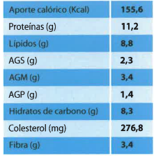 • Debido a la cantidad de proteínas que tiene una ración calculada para una   persona, se aconseja tomar como segundo plato ración pequeña (50-75 g) de carne o pescado acompañados por pasta, arroz o cereales. Para ademas, aportar algo más de Hidratos de carbono.